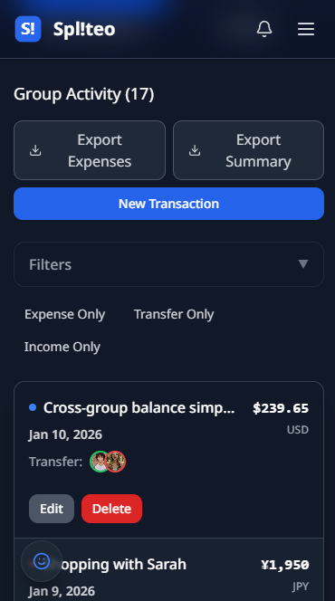 - Income — Log shared income such as a group refund or cashback.