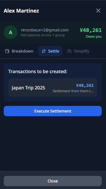- Settle — Creates settlement transfer transactions across all relevant groups, zeroing the balance. Add a description and tap Execute Settlement.