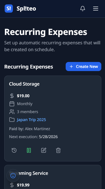 Rent, Netflix, utilities — some expenses happen every month. Instead of logging them manually, automate them. Navigate to Recurring Expenses via the More menu and tap + Create New. Configure the group, description, amount, frequency (Daily, Weekly, Monthly, or Yearly), start/end dates, payers, and recipients.